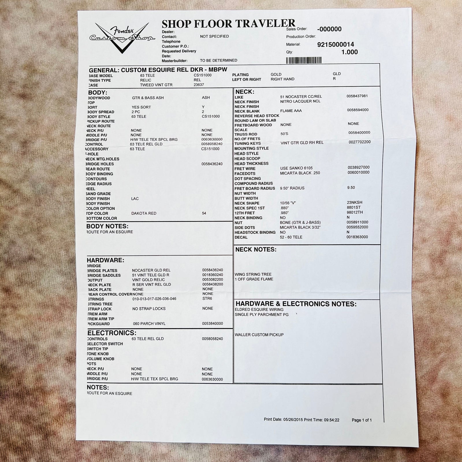 2010 Fender Custom Shop Custom Esquire Relic Dakota Red Specs List