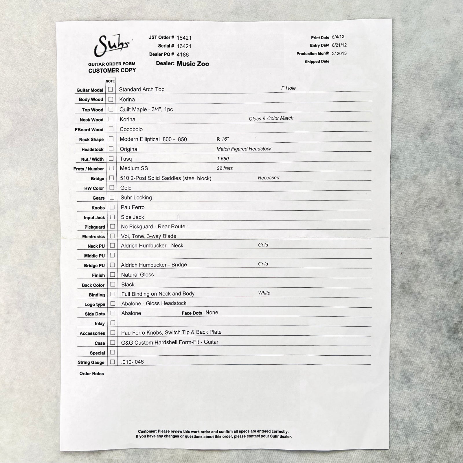 2013 Suhr Standard Arch Top Semi-Hollow Quilt Natural Specs List